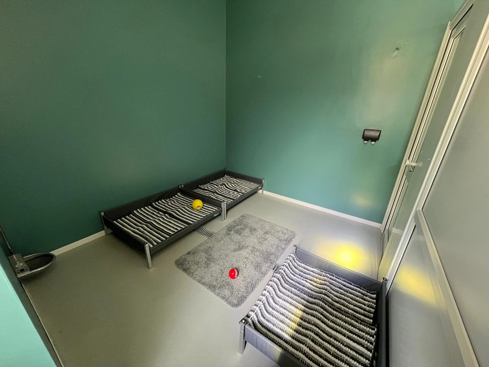 Outside we have approximately 4 acres of enclosed exercise fields. These fields have been sectioned into separate enclosed areas to ensure there is not only the opportunity for off-lead play and socialisation – but also a separate area for those dogs to exercise, who may be a little on the shyer side or who may be a little more anxious about being around other, new, doggy friends! In our exercise fields we have a sniff garden, a trampoline, tunnels and more fun agility games so your dog can stay thoroughly entertained during their stay with us.